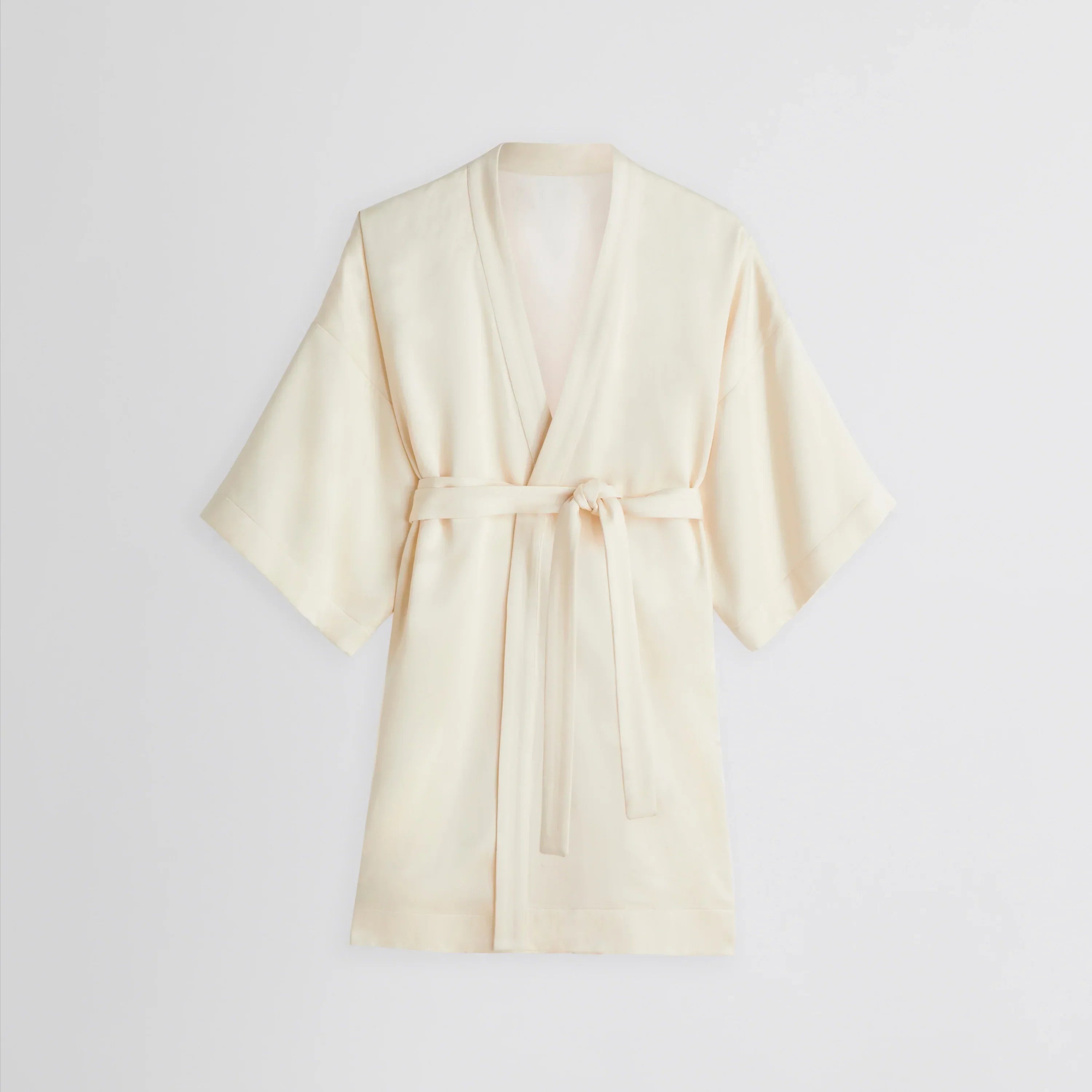 Cropped robe dress in cream crepe back satin. Cut for a relaxed fit, the wrap kimono dress has a flat collar, elbow-length sleeves, side pockets and an extra-long belt. The fabric has a fluid finish.
