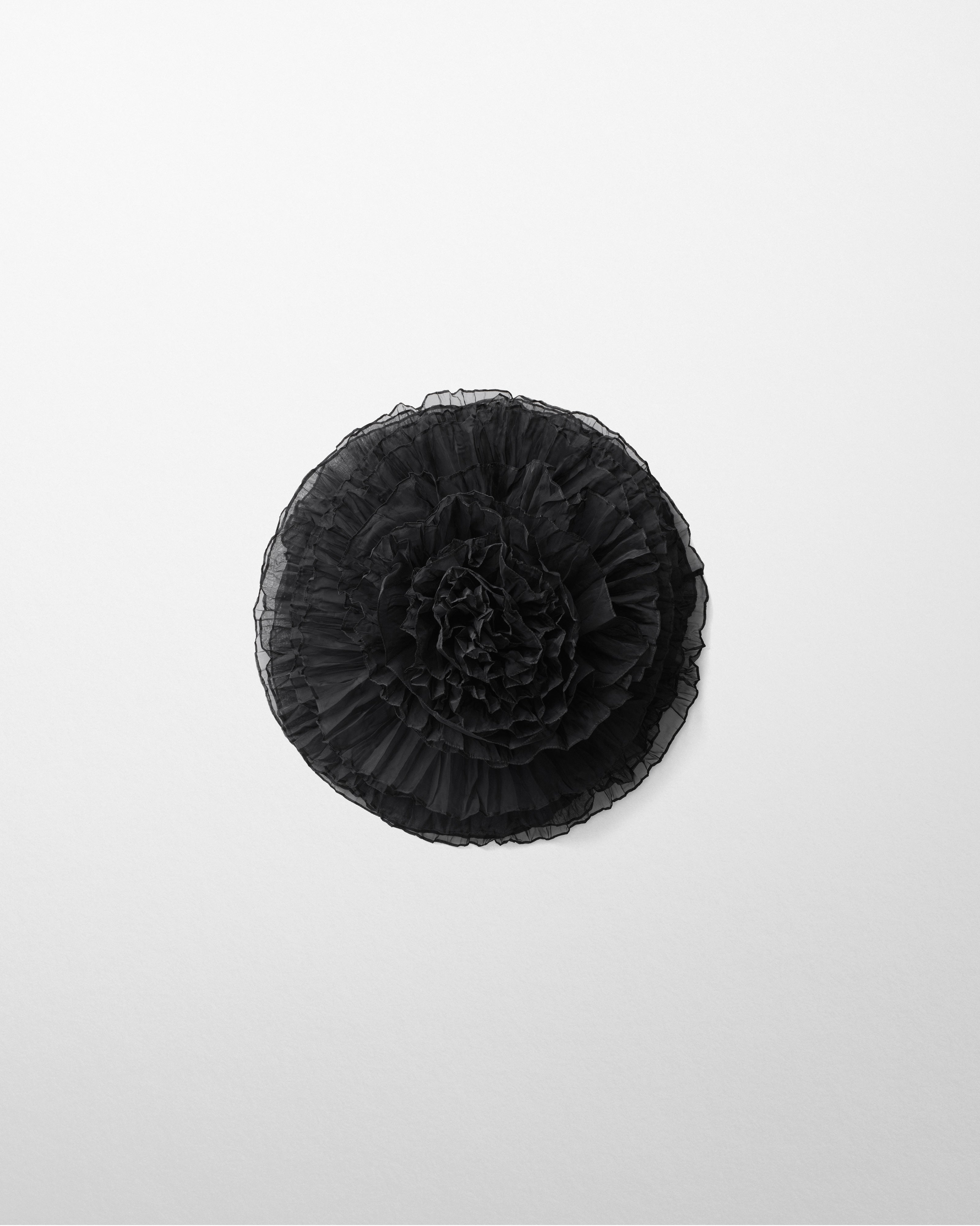 Large corsage brooch in black crushed and pleated silk organza. Pin with badge fastening.