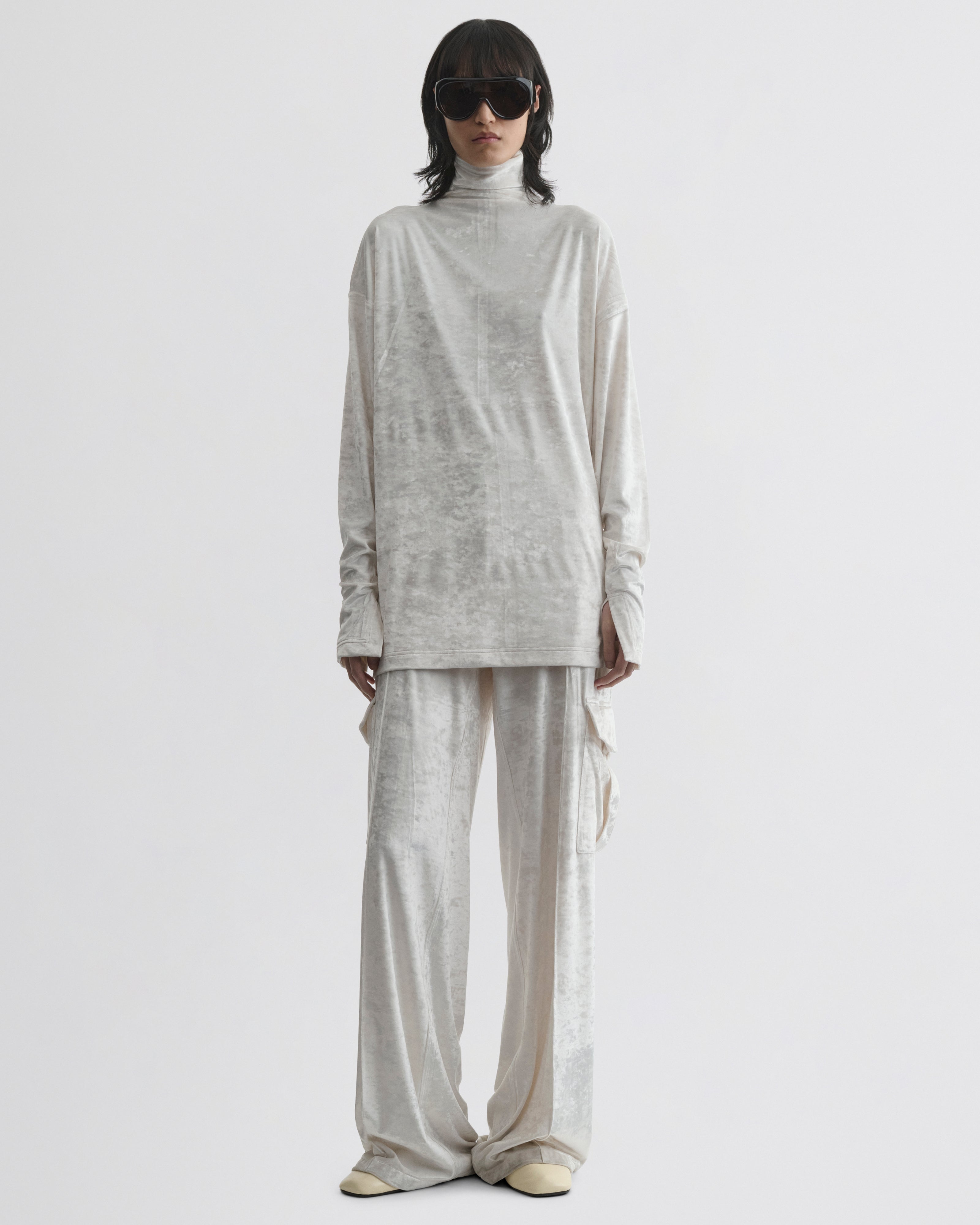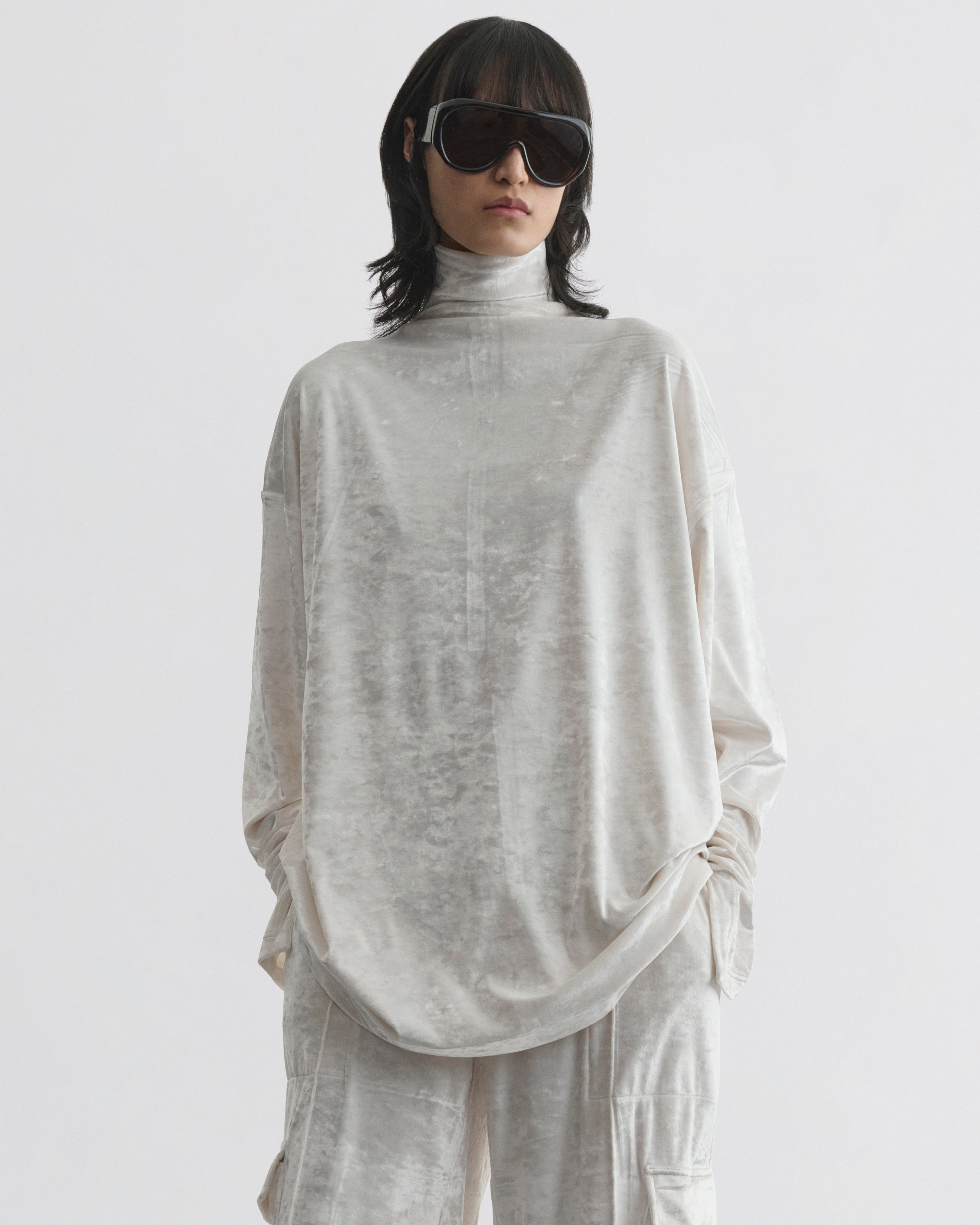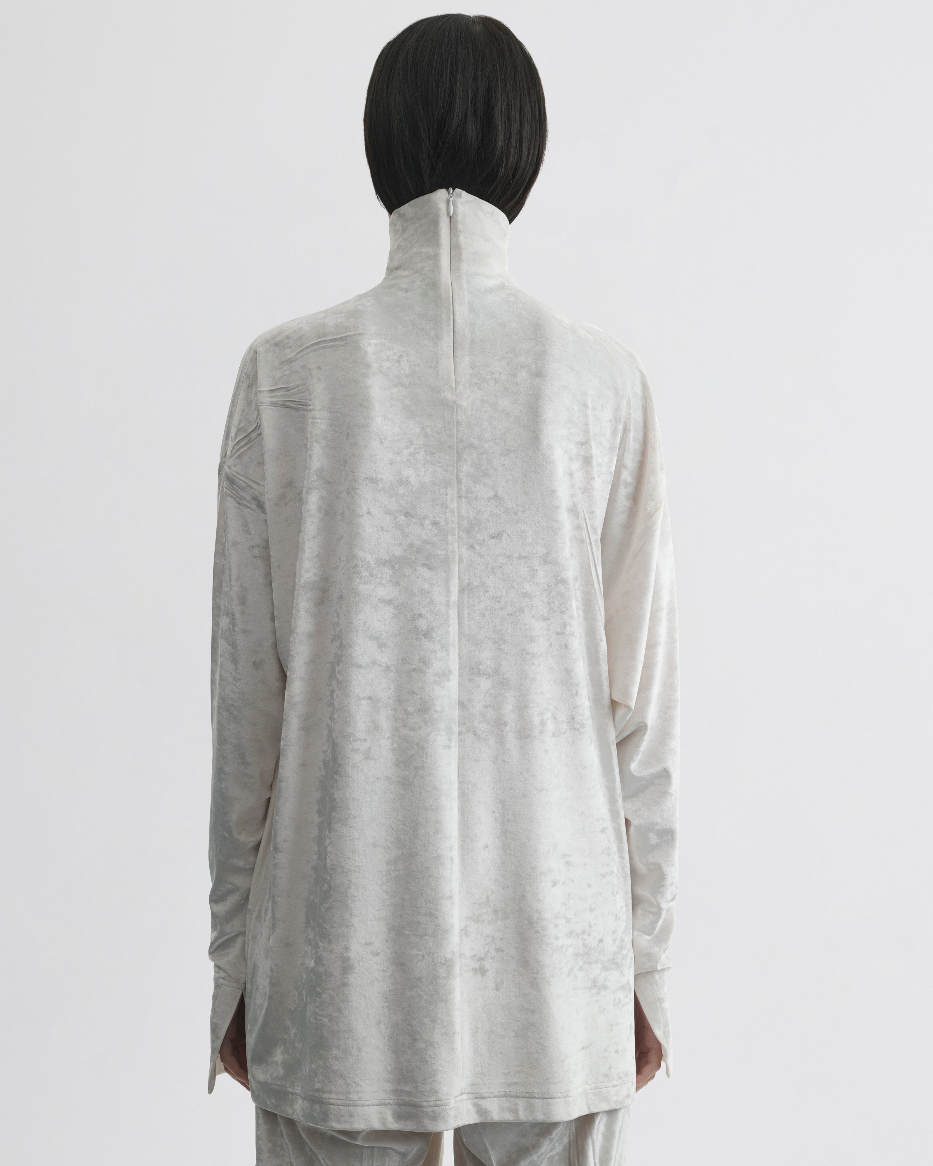 High neck top in white crushed velvet. Fluid and generously cut in the body with sleeves that narrow at the wrist. Zip fastening at the back of the neck.