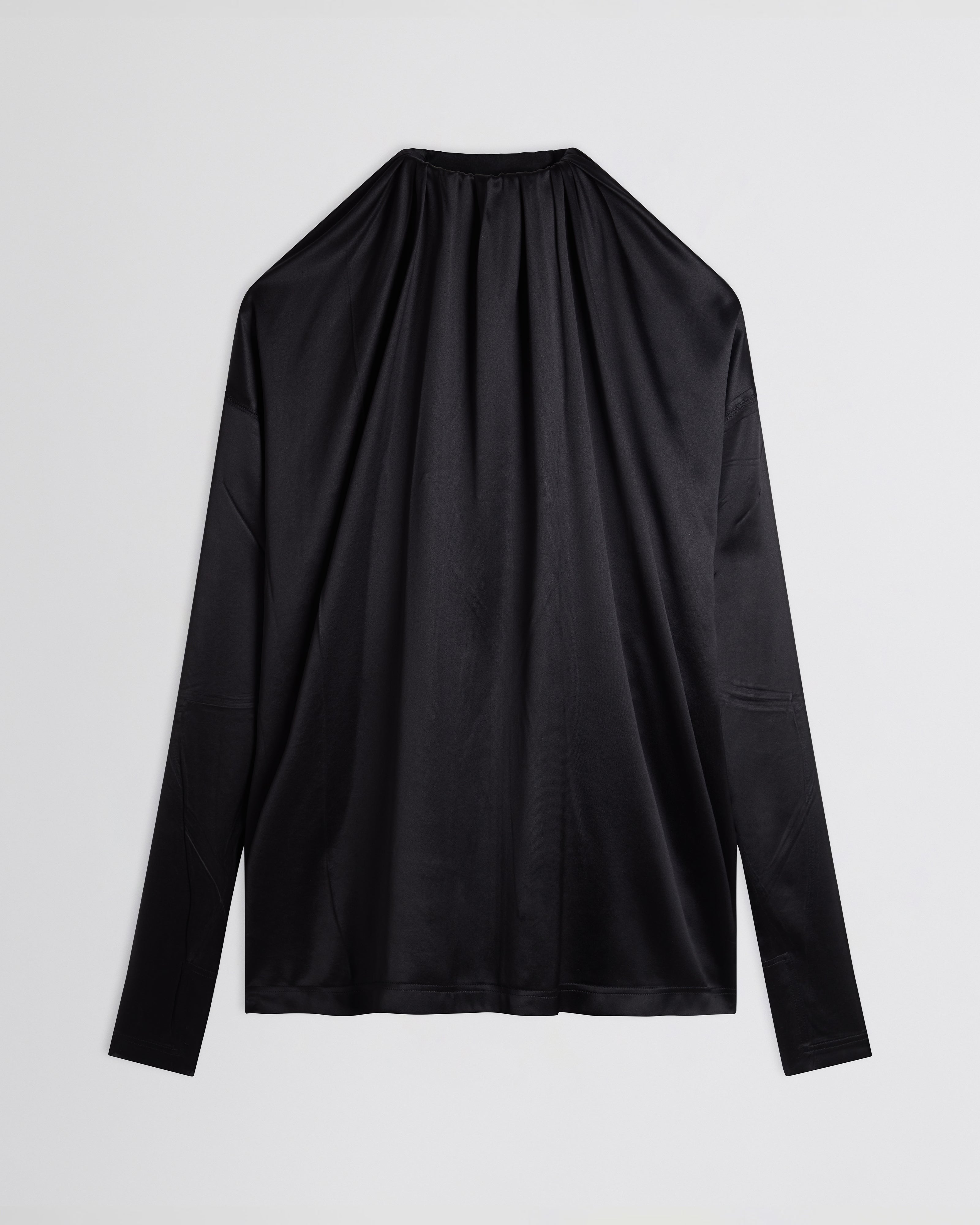 Liquid top in black silk satin. The glossy stretch fabric is gathered from the body to the neck in soft ridges to give a sculptural silhouette. Zip fastening at the back.