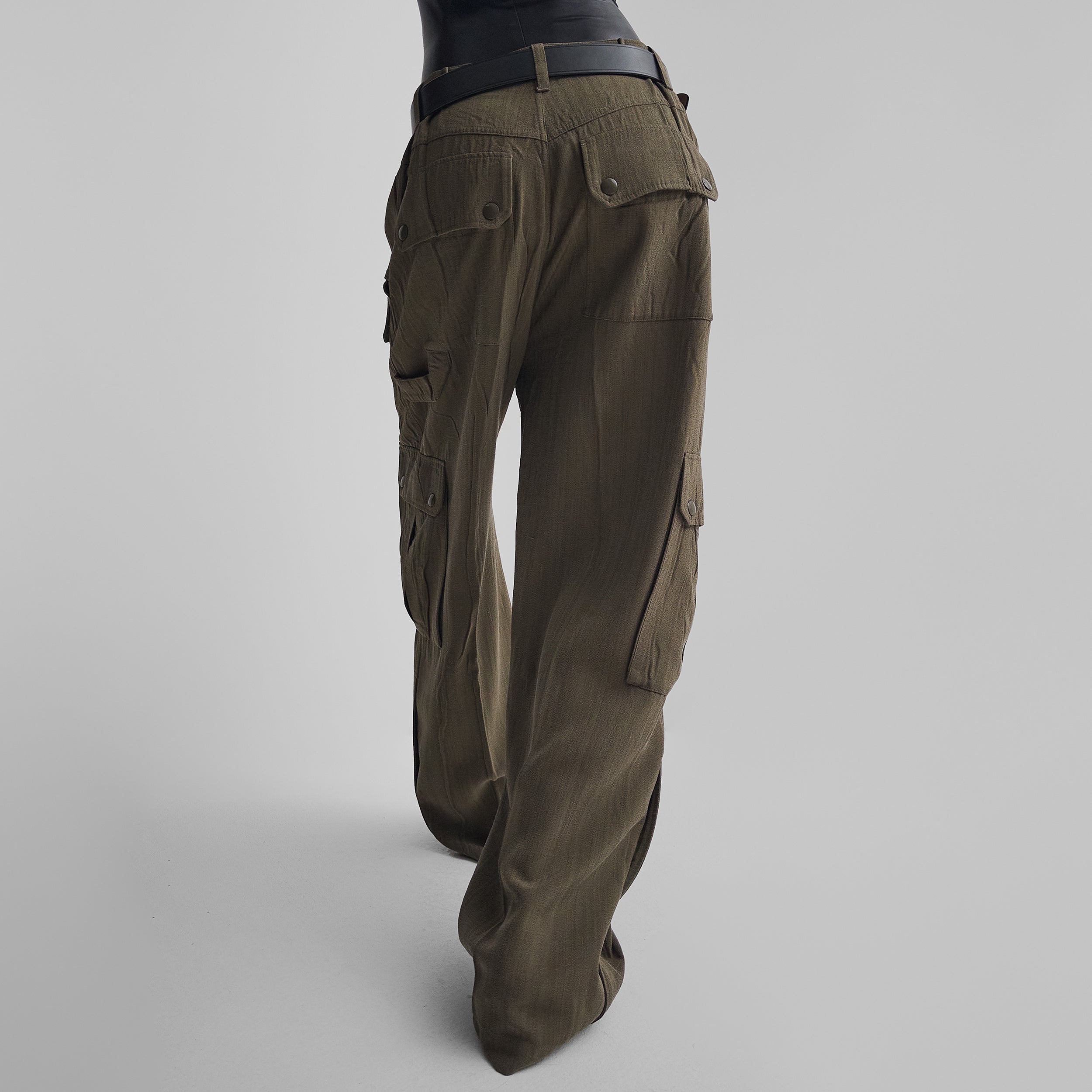 Cargo trousers with patch pockets in lightweight washed viscose silk canvas. The fluid suit trousers are sharp pressed and have an exaggerated fit.