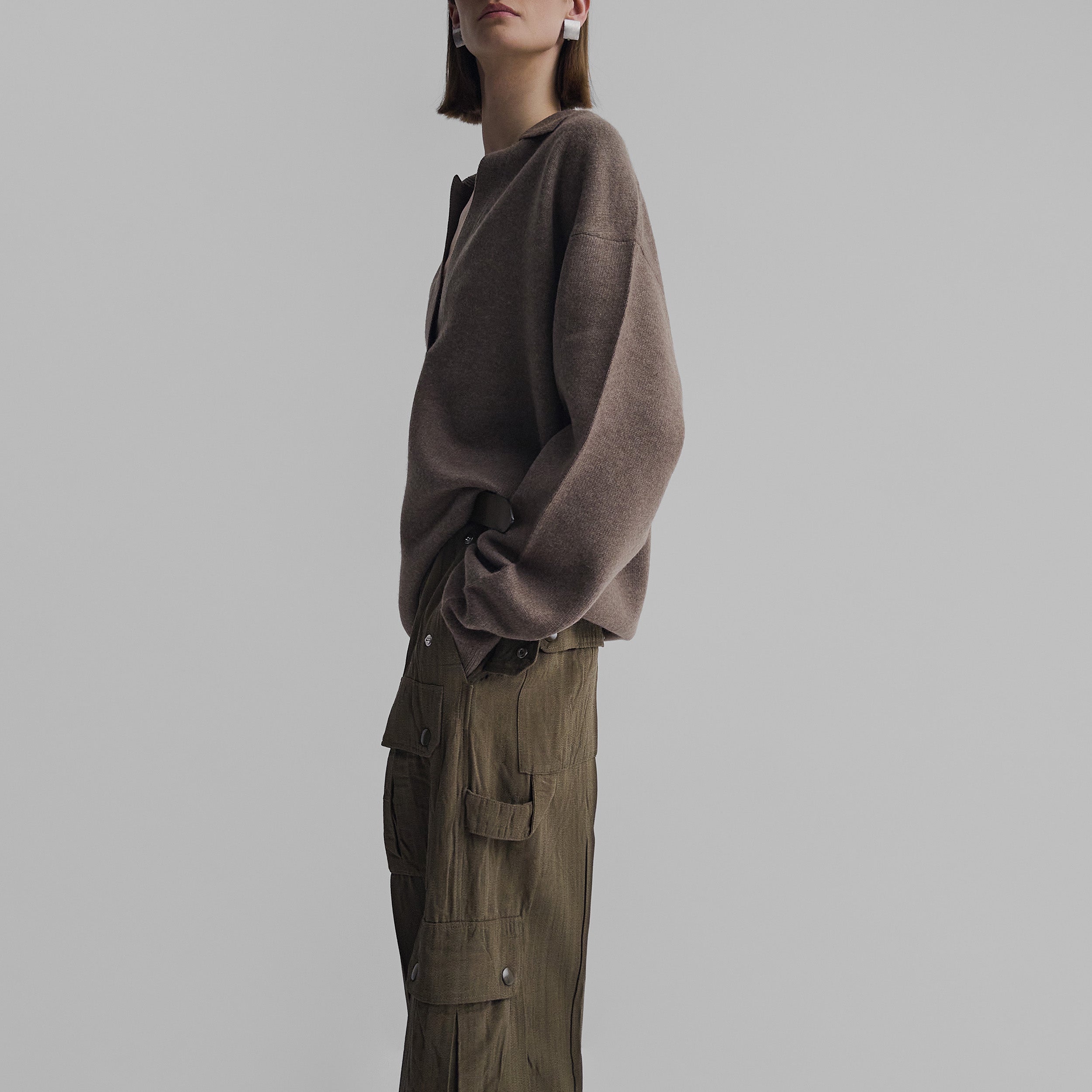 Soft shirt collar jumper in dun extra-fine felted wool cashmere. The jumper has a loose, comfortable fit.