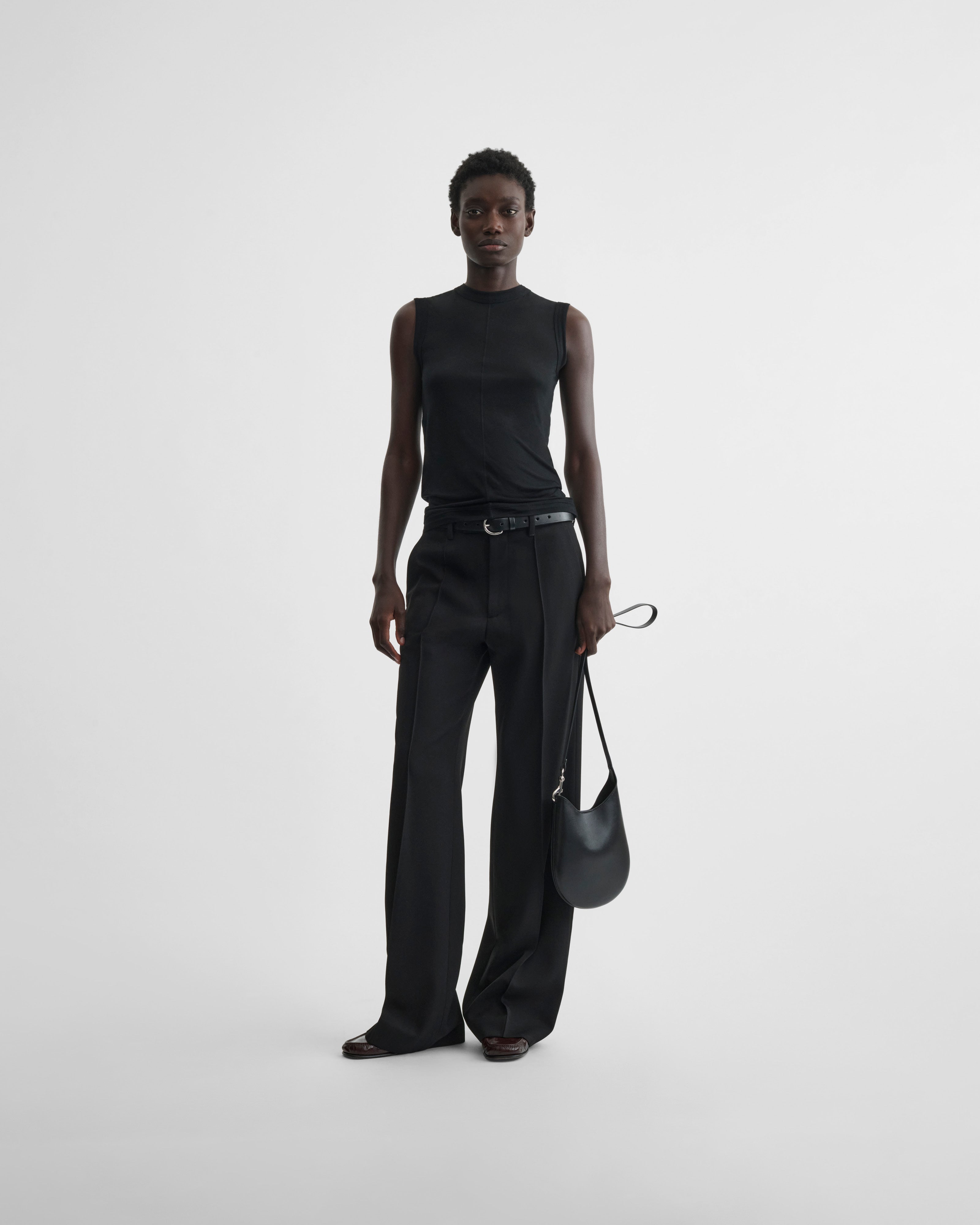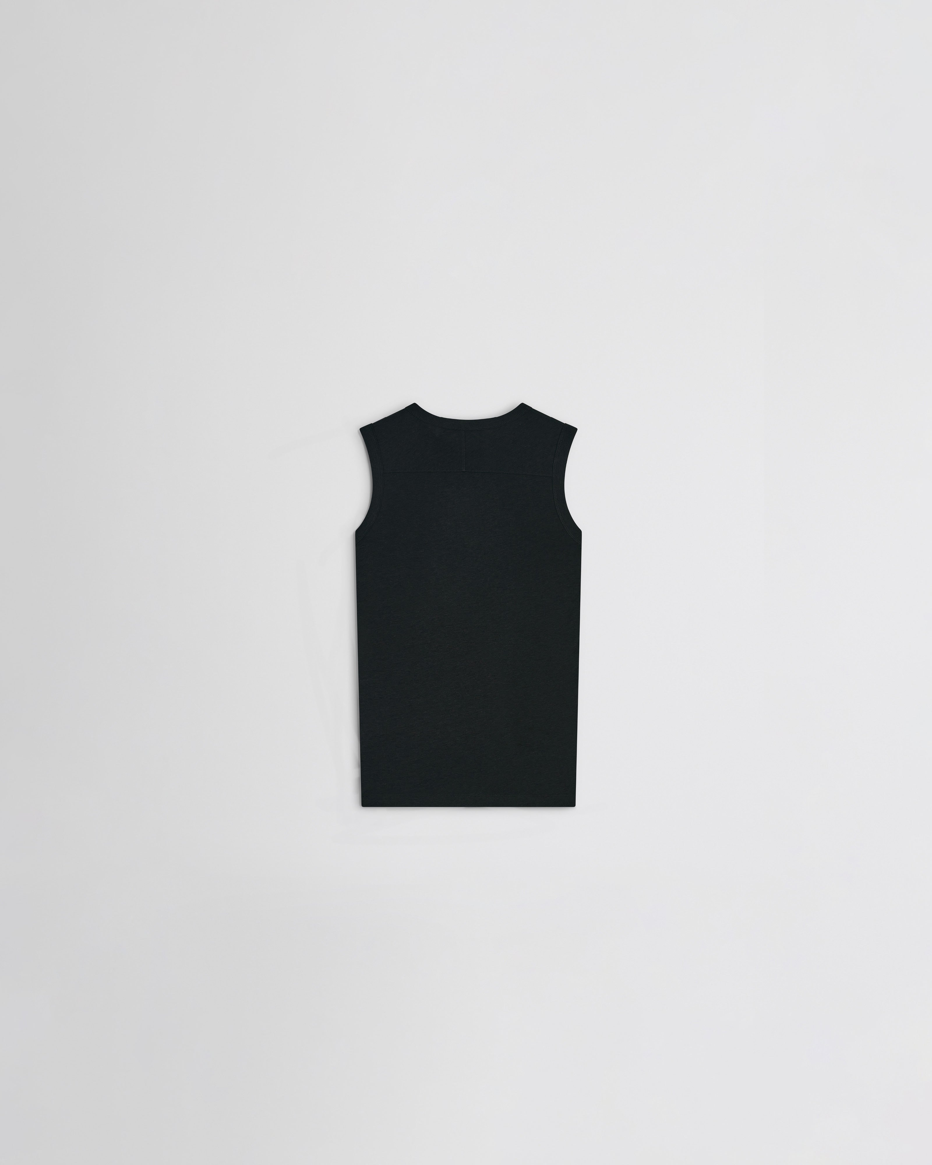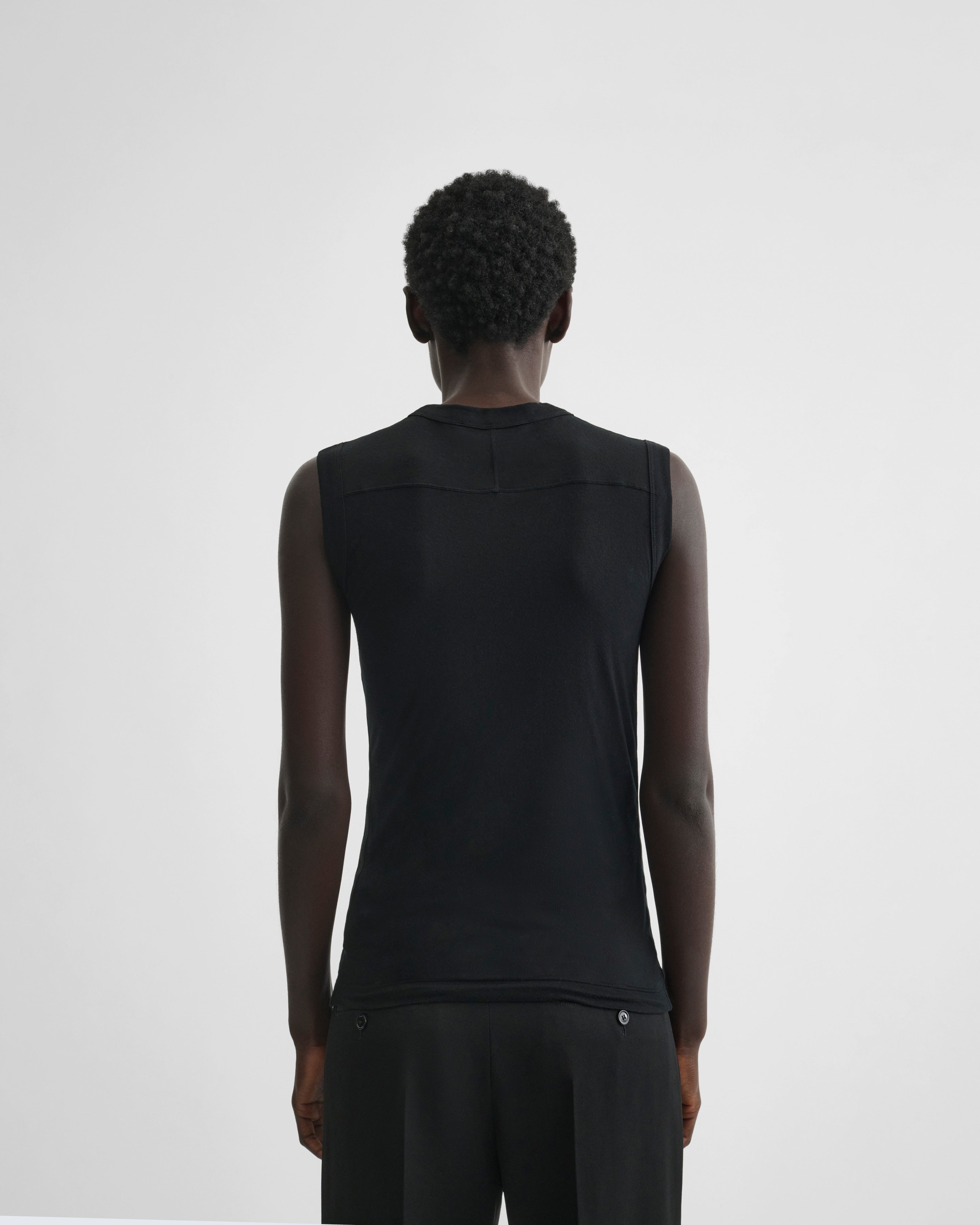 Crewneck tank top in ultra-fine black cotton. Semi-sheer, the slub top has an opaque ribbed neck, rolled cuffs and hem, and vanilla cotton taping detail on the seams. Double layered.